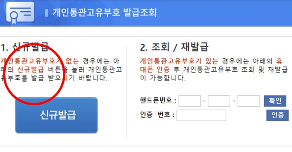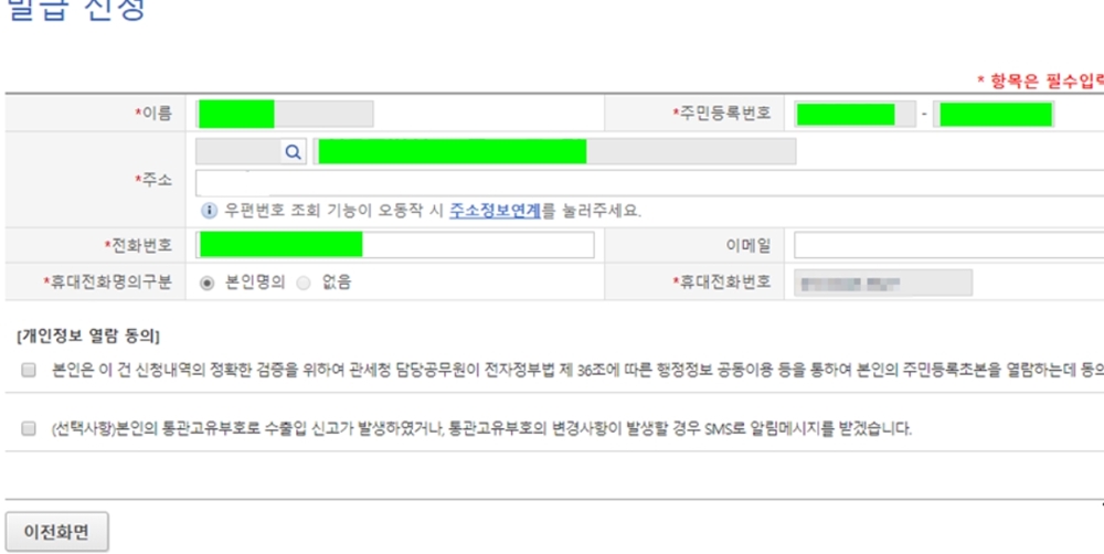 3. 신규발급을 클릭하고 개인정보 입력 및 동의목록에 꼼꼼히 확인하여 동의에 체크하고 개인통관고유부호 발급을 신청