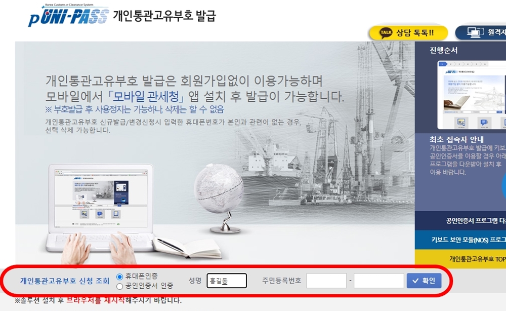 2. 사이트 중앙에 인증방법을 선택하고 이름과 주민번호를 입력하여 확인버튼 클릭. (팝업창 해제)