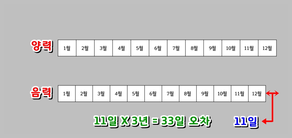 달의 움직임을 기준으로 만든 달력인 음력은 주기가 사실 30일이 아니라 정확하게 따져보면 29.5일이기 때문에 12개월을 곱하면 1년은 354일로 계산됩니다. 양력의 1년은 365일이므로 양력과 11일의 차이가 발생합니다.