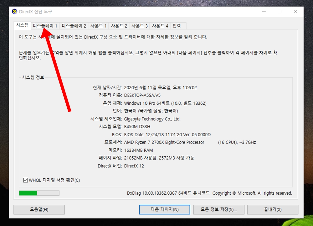 컴퓨터의 속도에 따라서 조금 다르지만 약 5초안에 사진과 같은 DirextX 진단 도구라고 쓰여진 새로운 팝업창이 뜰것이다. 여기서 시스템 바로 옆에 디스플레이1을 클릭하자.