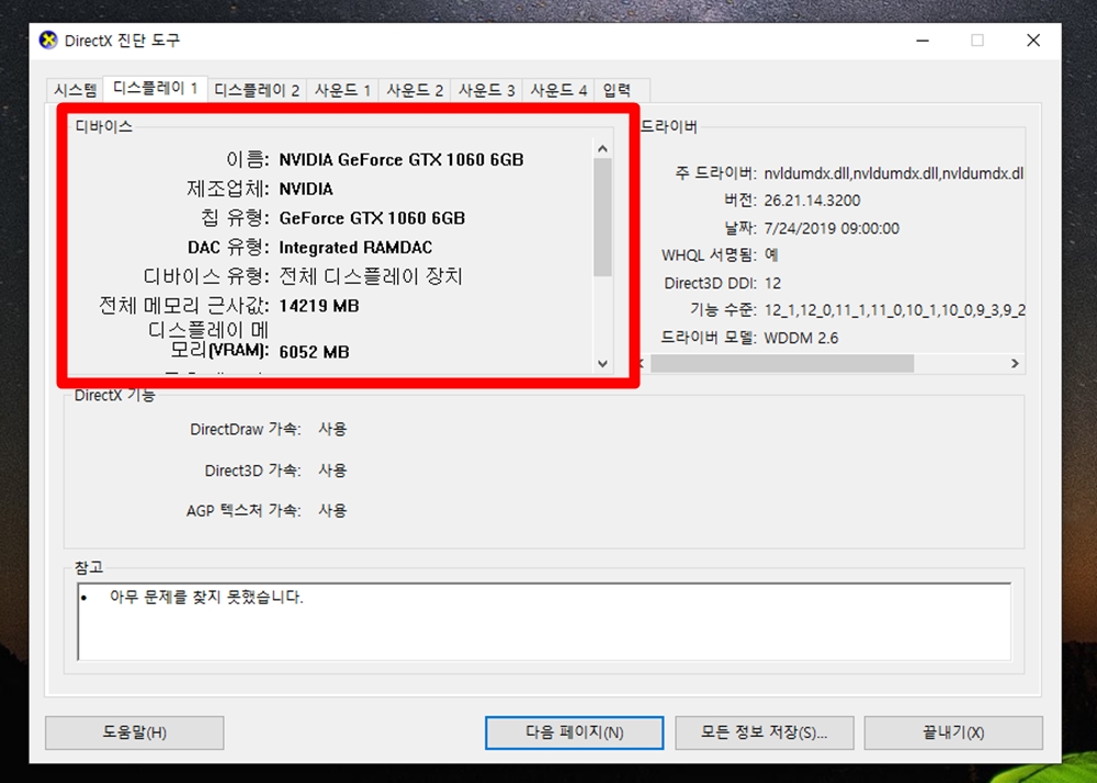 디스플레이1을 클릭하였다면 디바이스안에 내컴퓨터 그래픽카드의 성능을 확인할 수 있다. 너무 쉽지 않은가? 내컴퓨터도 2018년 당시에 가성비 좋기로 유명한 GTX 1060이었다. 기억이 맞다면 3GB와 6GB에서 고민을 많이 했었는데, 가격차이가 크지않아서 6GB로 결정했던것이 기억난다.