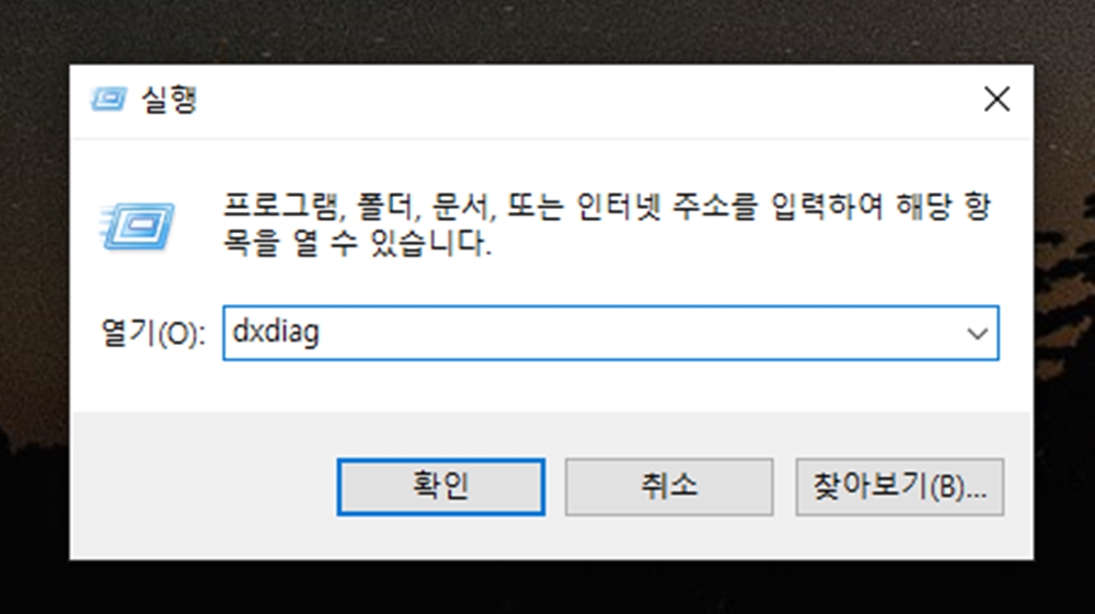 방법은 이러하다. 윈도우7이던 윈도우10이던 작업표시줄 왼쪽 아래의 시작을 클릭하고 실행(R)을 눌러주자. 그럼 사진처럼 검색창같은 빈박스가 포함된 실행 팝업창이 뜨는데, 이곳에 dxdiag 라고 키보드로 글을 쓴후 확인을 눌러준다.