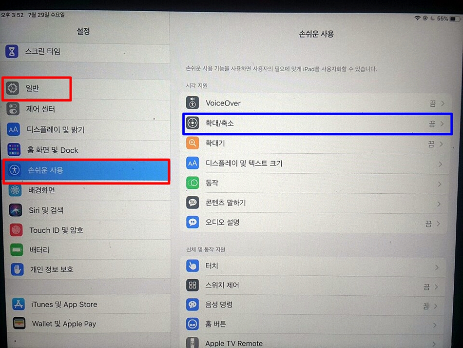 그렇기에 [설정-일반-손쉬운사용]에 들어가서 화면 확대/축소 기능을 OFF했다가 다시 ON을 하게되면 확대/축소되어 보이지 않았던 상단바가 보일 수 있다.