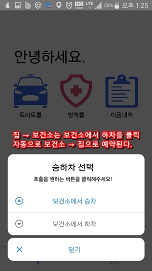 그리고 예약을 하면 집에서 지정한 보건소까지 이동해주고 돌아오는것까지 자동으로 해주기 때문에 따로 돌아오는 것을 예약할 필요가 없으며, 보건소에서 검사를 받는동안에는 미터기를 중지하기 때문에 돈걱정 할 필요없다.