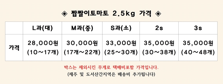 처음 시키시는 분들은 2S과나 3S과를 먹어보시는게 좋아요 왜냐하면 짭짤이 토마토는 작으면 작을수록 한입에 쏙 들어가기에 식감도 좋고 더 맛있고, 개체수가 적어서 많은분들이 일부로 더 작은것을 찾으신다고 하더라구요 ~ 저도 왠만하면 3s과 크기를 선호하는 편이지만, 큰것도 맛잇어요 ~